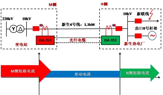 200785日某220kV變電站10kV重生4號線光纖分相電流差動保護動作,開關跳閘,經巡線人員檢查、毛病點在新聯線出口0號桿處保護人員檢查兩邊保護裝置,仿照區內外毛病保護均反應正確,如下圖所示,試剖析跳閘緣由。